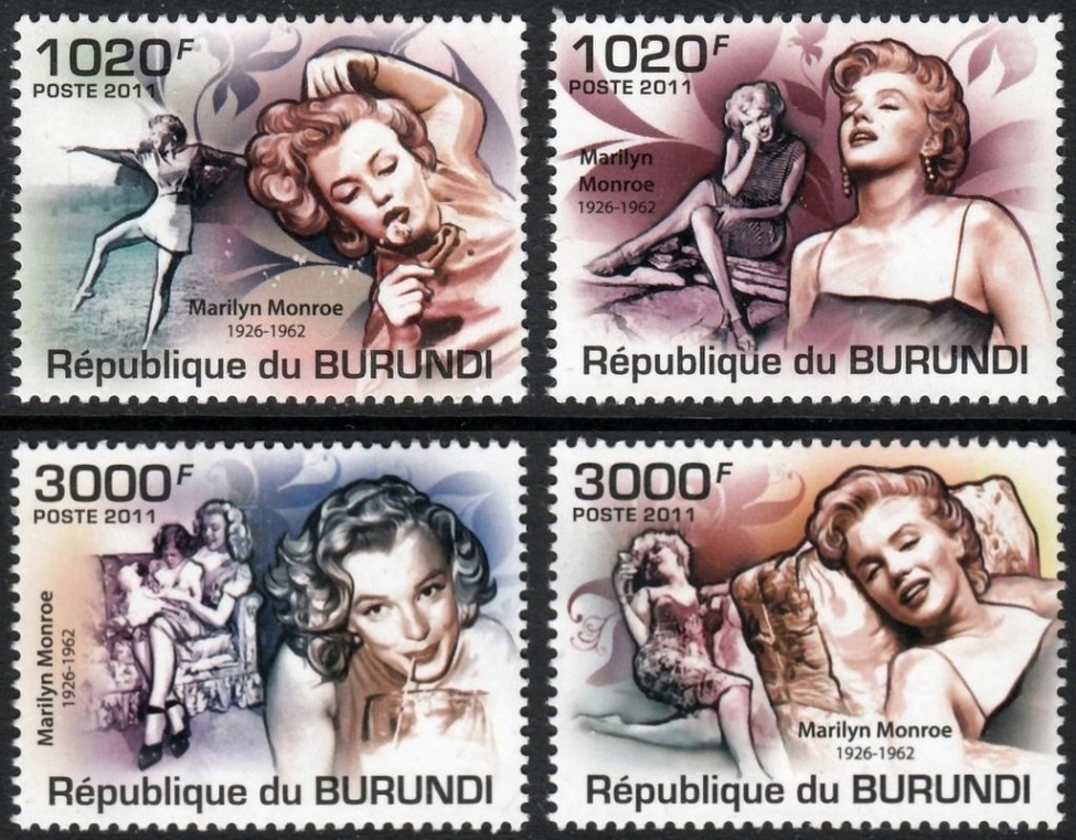 Úvod › Známky (podle zemí a témat) › TÉMATICKÉ, NÁMĚTOVÉ › Umění › Kino › Poštovní známky Burundi 2011 Marilyn Monroe Mi# 2218-21 Kat 9.50€